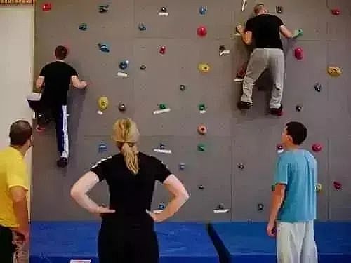 下图为哈尔登监狱攀岩墙,监狱里至少提供50种体育和娱乐施舍,只有下图中的女警充当教练,其余所有图片出现的人物都是囚犯。